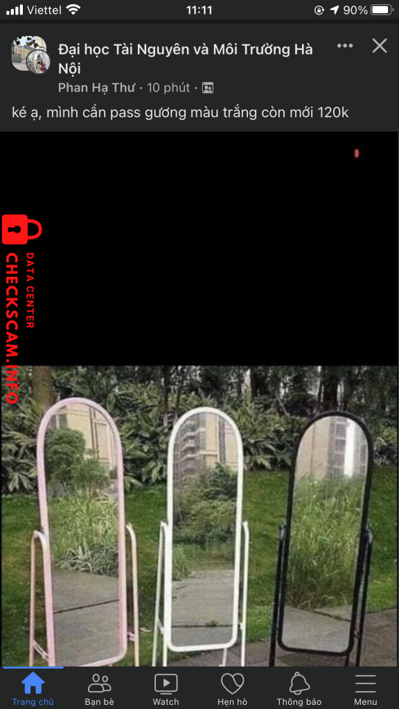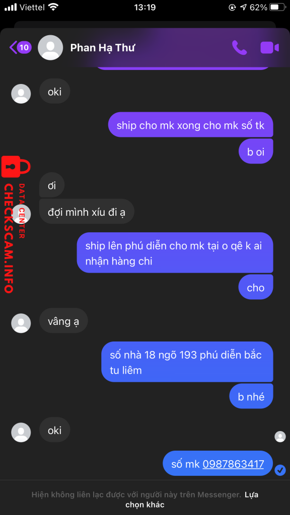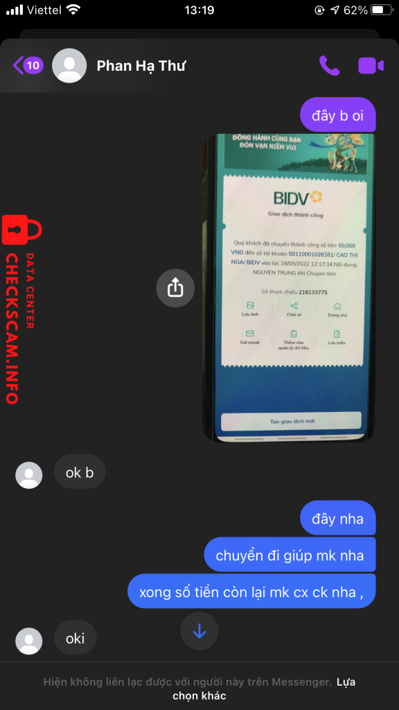Προειδοποίηση Απατεώνα: CAO THI NGA Αναφέρθηκε: November 16, 2024 Πληροφορίες Απατεώνα Πλήρες Όνομα: CAO THI NGA Πύλη Πληρωμής: bidv Λογαριασμός Πληρωμής: 50110001026161 Κατηγορία: Απάτες αγοράς Πηγή: Checkscam Αρχεία Αποδεικτικών Περιγραφή Αναφοράς FB là Phan Hạ Thư đăng bán gương di động trên group rồi kêu cọc 50k sau minh ck thì chặn mình luôn Σχόλια Το σχόλιό σας Προσθήκη Σχολίου Δεν υπάρχουν ακόμη σχόλια. Γίνετε ο πρώτος που θα μοιραστεί την εμπειρία του με αυτόν τον απατεώνα.