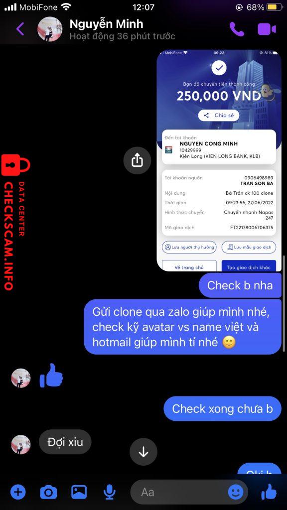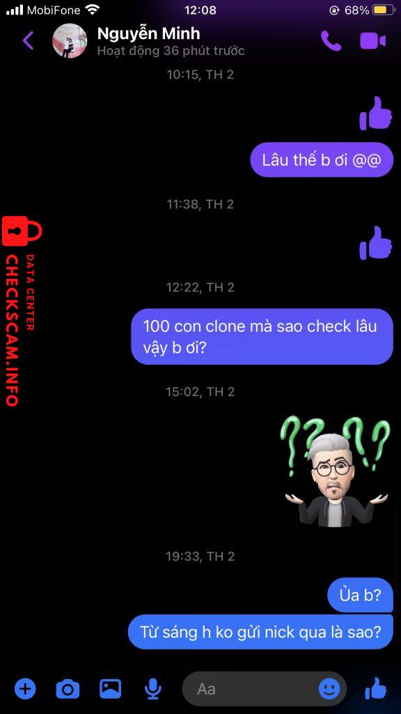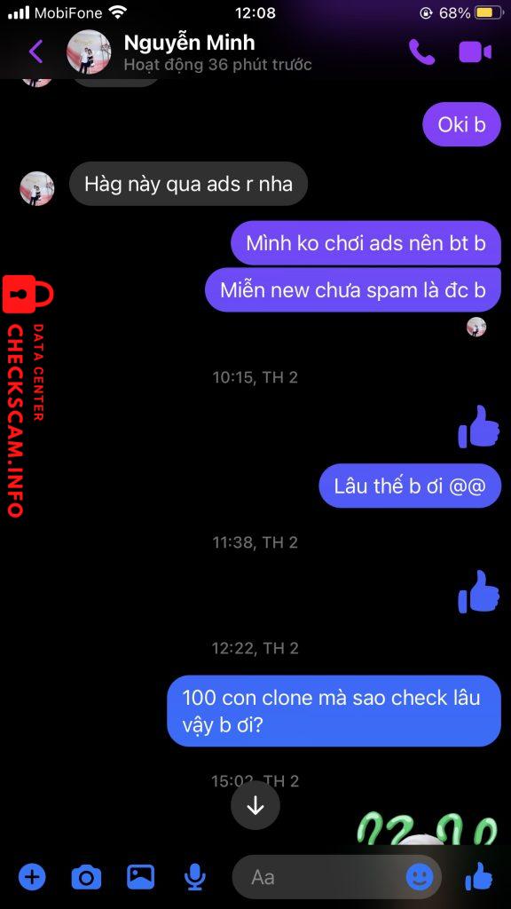 Tôi liên hệ mua 100 clone Fb giá 250k. Nhưng CK xong thì tên này mất tích 2-3 ngày ko thấy nhắn tin để chuyển clone cho tôi. Nguyễn Công Minh lừa đảo rõ ràng ad. Mong ad xem xét. Cám ơn ad
