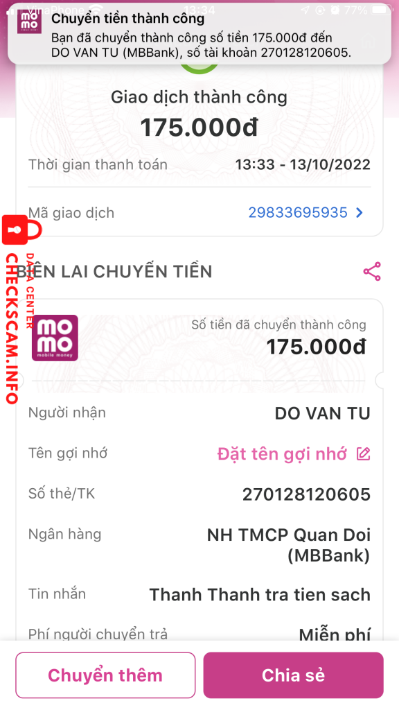 Alerta de estafador: DO VAN TU Reportado: November 16, 2024 Información del estafador Nombre completo: DO VAN TU Puerta de pago: MB Cuenta de pago: 270128120605 Categoría: Estafas de mercados online Fuente: Checkscam Archivos de evidencia Descripción del informe Lừa đảo bán sách Chuyển tiền rồi acc mất Khách khác cũng bị lừa , người lừa bảo là không ai chốt quyển đó hết trong khi tôi đã chốt và chuyển tiền rồi Comentarios Tu comentario Añadir comentario Aún no hay comentarios. Sé el primero en compartir tu experiencia con este estafador.