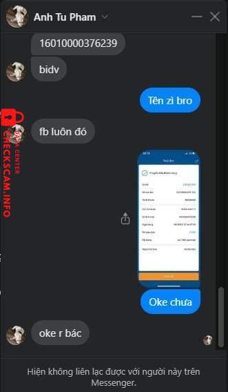 Alerto sa Scammer: Anh Tu Pham Naiulat na: November 16, 2024 Impormasyon ng Scammer Buong Pangalan: Anh Tu Pham Payment Gate: Bidv Account ng Pagbabayad: 16010000376239 Kategorya: Mga panloloko sa marketplace Pinagmulan: Checkscam Mga File ng Ebidensya Paglalarawan ng Ulat Lừa cọc xong sủi Mga Komento Ang iyong komento Magdagdag ng Komento Wala pang mga komento. Maging una sa pagbabahagi ng iyong karanasan sa scammer na ito.