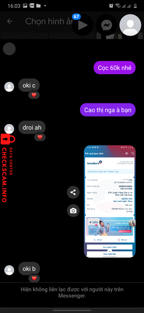 Alerto sa Scammer: CAO THI NGA Naiulat na: November 16, 2024 Impormasyon ng Scammer Buong Pangalan: CAO THI NGA Payment Gate: BIDV Account ng Pagbabayad: 50110001026161 Kategorya: Mga panloloko sa marketplace Pinagmulan: Checkscam Mga File ng Ebidensya Paglalarawan ng Ulat Bắt cọc xong chặn Mga Komento Ang iyong komento Magdagdag ng Komento Wala pang mga komento. Maging una sa pagbabahagi ng iyong karanasan sa scammer na ito.
