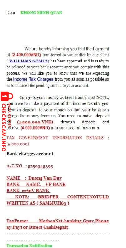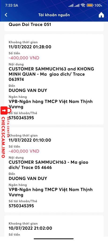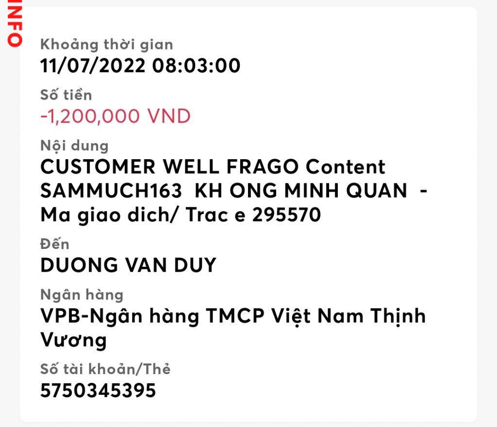 Mình đăng bán điện thoại trên chợ tốt. Sau đó có người Mỹ liên hệ với mình qua zalo ngỏ ý muốn mua cho người em ở Hoài Đức, HN. Và bảo sẽ đến ngân hàng wells fargo để chuyển tiền cho mình. Họ bắt mình đóng phí lần đầu là 400k. Mình chuyển với nội dung như mail gửi nhưng họ bảo sai, phải kèm tên và bảo mình gửi lại. Lần 2 họ bảo chuyển phí 1200k để nhận tiền và mình vẫn chuyển như nội dung mail. Họ lại bảo sai và chuyển lại. Mình phải vay mượn thêm để chuyển vì k muốn mất số tiền đã chuyển cho họ. Sau khi làm xong hết thủ tục thì họ bảo ngân hàng sắp phá sản, họ phải sang ngân hàng khác. Sang ngân hàng khác, họ bắt mình đóng phí 500k tiền tạo tài khoản gì đó. Mình lúc này đã hết tiền nên không chuyển được thì họ cứ giục chuyển, họ lấy lí do phải đi làm nên bắt mình chuyển gấp. Sau đó mình đã biết bị lừa nên không chuyển nữa. Và số tiền mình chuyển cho stk DUONG VAN HUY kia là 3200k và mình mất sạch?