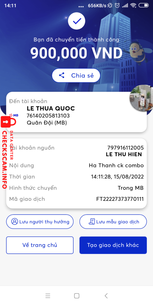 Alerto sa Scammer: Le Thua Quoc Naiulat na: November 16, 2024 Impormasyon ng Scammer Buong Pangalan: Le Thua Quoc Payment Gate: Mb Account ng Pagbabayad: 76140205813103 Kategorya: Mga panloloko sa marketplace Pinagmulan: Checkscam Mga File ng Ebidensya Paglalarawan ng Ulat Hack fb lừa tiền Mga Komento Ang iyong komento Magdagdag ng Komento Wala pang mga komento. Maging una sa pagbabahagi ng iyong karanasan sa scammer na ito.