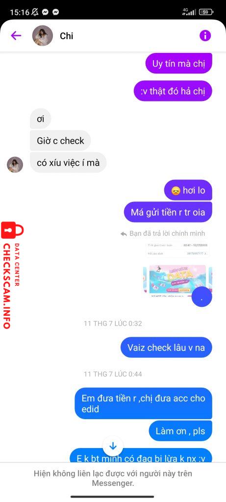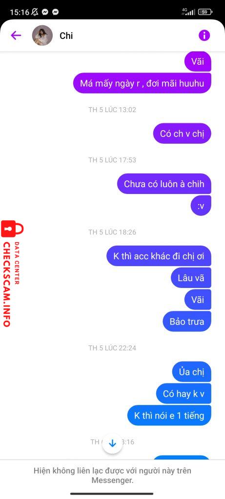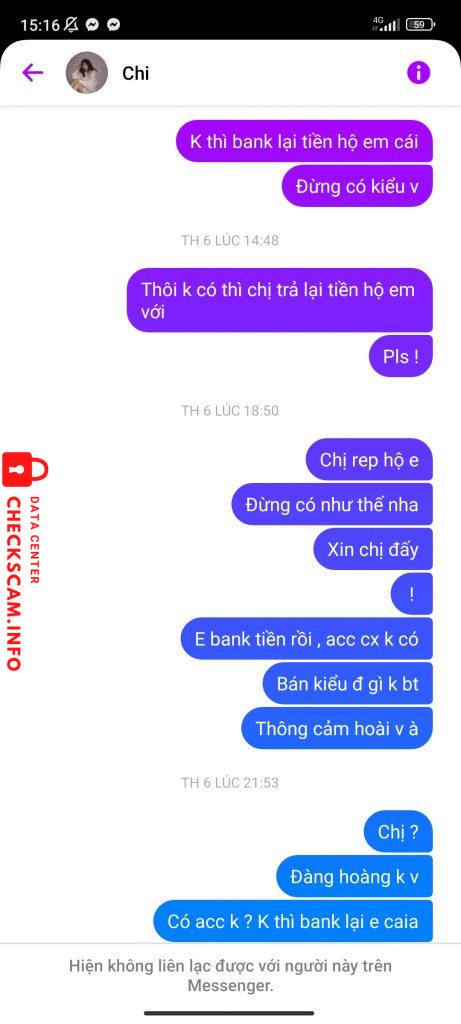 Alerto sa Scammer: Linh Chi Naiulat na: November 16, 2024 Impormasyon ng Scammer Buong Pangalan: Linh Chi Payment Gate: Momo Account ng Pagbabayad: 0878758596 Kategorya: Mga panloloko sa marketplace Pinagmulan: Checkscam Mga File ng Ebidensya Paglalarawan ng Ulat Lừa Đảo Mga Komento Ang iyong komento Magdagdag ng Komento Wala pang mga komento. Maging una sa pagbabahagi ng iyong karanasan sa scammer na ito.