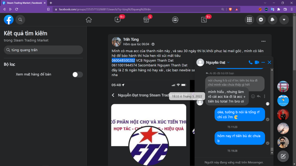 Nó đã lừa khá nhiều anh em trong group steam trading, người đăng bài trên là 1 trader cũng đã bị nó scam vài triệu, còn mình thì bị nó scam 10 triệu, bằng chứng là bill chứng minh là mình có chuyển tiền cho nó và đoạn chat cũng có nói là total tiền acc và tiền bù là 7m nhưng đấy là chưa tính thêm khoản tiền mình cho vào tài khoản đấy do nó nhây quá nên mình phải chấp nhận tạm thời bỏ qua khoản đấy. Nếu ad muốn thêm bằng chứng bằng những đoạn chat của mình trong 2 tháng với nó thì mình sẽ cung cấp thêm. Nó có 1 tài khoản bank nữa là 0611001944574 Ngân hàng VCB cũng đứng tên Nguyen Thanh Dat