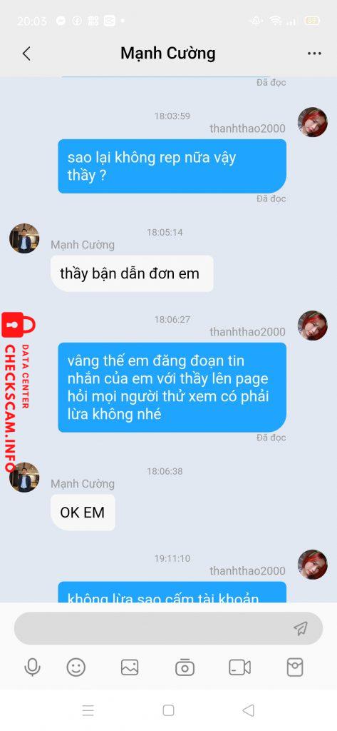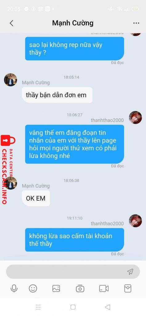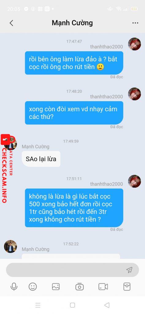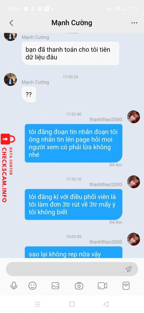 Ngày 9/7 người dẫn ở bên Zalo nhắn cho mình là có đơn 500k mình đã nạp 500k vào để làm nhiệm vụ nhưng vừa nạp xong chị ý bảo hết nhiệm vụ các thứ . Ngày nào mình cũng ib hỏi bạn bên Zalo bạn ấy đều bảo là chỉ còn đơn 1tr . Đến hôm 16/7 mình đã nạp thêm 500k để làm đơn 1tr để rút tiền về cho xong . Nó vào điểm cho mình nó bảo mình ib với thằng thầy bên app xong thằng thầy bảo với mình là hết đơn 1tr rồi làm đơn 3tr đi mình cũng nạp thêm 2tr để làm đơn 3tr xong thằng thầy nó lươn nó hẹn mình 14h30 . Lúc 14h30 nó hẹn mình nó cho mình làm nhiệm vụ nó bảo có muốn kiếm thêm hoa hồng không nó không nói rõ là cái gì xong nó chỉ mình làm lên hơn 110tr điểm xong nó bảo chia đôi cho nó 53tr . Nó bảo bắn tk cho nó 53tt thì nó mới cho mình rút tiền . Mình thấy nhiều tiền quá mình không bank nữa và xin nó cho mình rút tiền nó không cho . Xong đến tối nó ib với mình nó không cần bank tiền nữa nó muốn xem những vd nhậy cảm của mình nó bảo mình gửi nó cho mình rút tiền . Xong đến hôm nay nó hỏi mình là có muốn rút tiền không nó bảo gửi vd nhạy cảm nó cho rút tiền. Xong mình bảo nó là lừa đảo à từ lúc đó nó không rep xong mình bảo đăng đoạn tin nhắn của mình lên hỏi m.n 1 lúc nó khóa tk trong app của mình luôn . 3 tr không nhiều nhưng làm ăn lừa đảo vậy