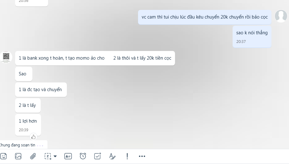 Mình có nhờ th này liên kết mm ảo lúc đầu nó bảo mình bank 20k xong rồi làm bank xong thì nó lật và bảo đó chỉ là cọc chuyển đủ 50k thì mới làm mình kêu hoàn thì nó k chịu hoàn.Lừa đảo ae cẩn thận