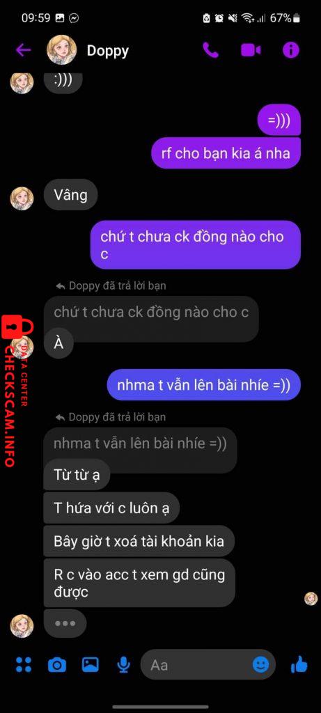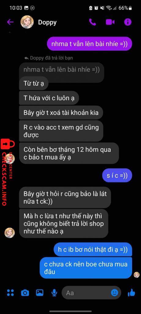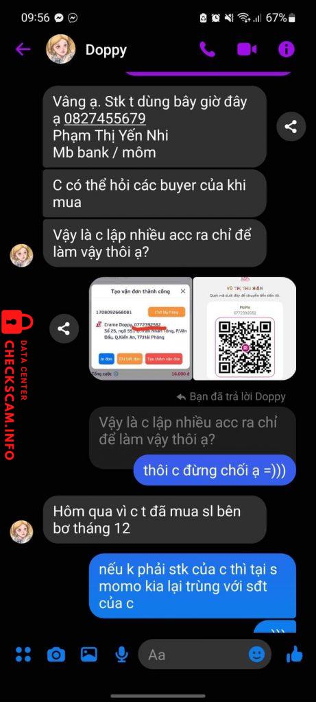 Bill ck và stk em tố cáo khác nhau vì scammer đi thuê stk (có ảnh chứng minh nó đi thuê ), bạn Doppy sài acc clone đi rao bán oitree kage jp oi ca shoto ykt, sau khi bị scam em cùng những bạn nạn nhân khác lập group và cố tạo clone (Delwyn) hỏi dò bắt quả tang thì ở acc (1) bạn í nói đã ck full và đang nhượng, acc (2) thì lại nói deal chưa sold và ép ôm, acc (3) lại là deal sold nhượng từ 500 xuống 350, acc (4) lại là deal nhưng mà chưa ck full trong khi ở acc (1) lại nói đã ck full, bọn em ngay lập tức nắm được đuôi nhưng vẫn chưa có bằng chứng xác minh acc clone và Doppy là 1, em lúc đấy chưa biết rằng cả 2 là 1 đã lên bài tố scam và để lộ tài khoản momo, các bạn khác đã thấy tên stk momo của acc scam và tên ig ở Doppy giống nhau=> cả 2 là 1. Sau khi tích đủ bằng chứng thì tụi em đi tìm những seller từng gd với ả giải thích và lấy được địa chỉ nhà và so sánh với stk momo cả 2 trùng sđt và tên người nhận là Doppy nắm thóp và đã được rf thành công. Dựa theo ảnh thì có thể em đăng thiếu và nhầm vì em cap rất nhiều ảnh nếu admin không hiểu có thể nói chuyện qua zalo với em =)))