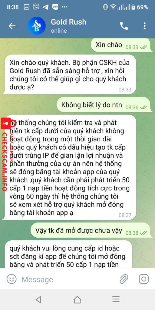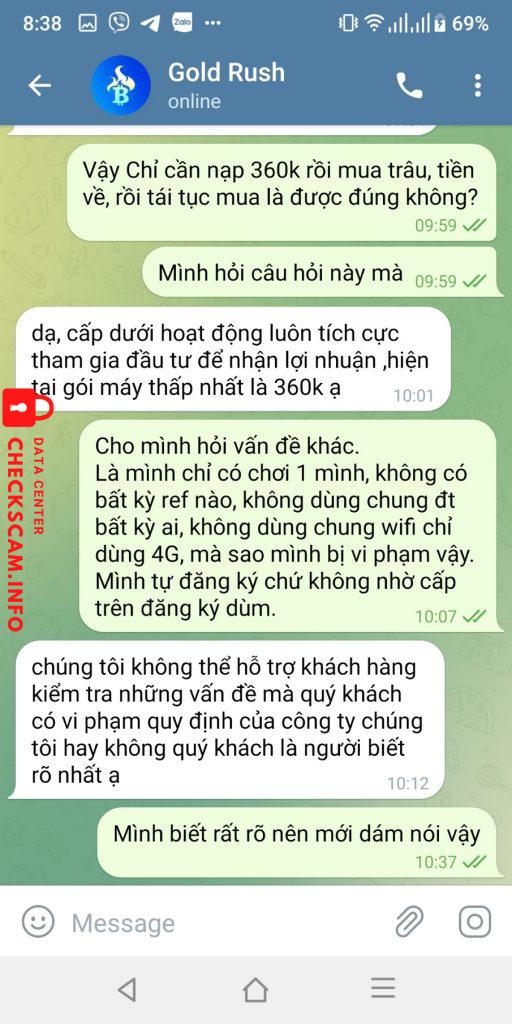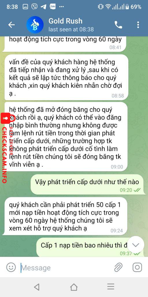 Tôi được một quen mời tham gia đầu tư qua mạng, qua app gì đó. Lãi suất cũng rất cao. Ban đầu thì không vấn đề gì. Trong thời gian tìm hiểu thì người tổng đại lý nói là an toàn trong khoản tới ngày 25.4 Nhưng đến ngày 24.3 thì xảy ra vấn đề không ai rút tiền được, rồi sau đó ngày 26.3 mọi tài khoản bị khóa. Hỏi CSKH thì họ nói do vi phạm này kia, trùng ip, trùng thiết bị, cấp trên gian lận, trong khi có nhiều tk không có cấp dưới, không trùng ip, không trùng thiết bị cũng bị. Họ yêu cầu phải mời 50 người, mỗi người nạp tối thiểu 360k, thì mình mới được rút tiền về. Cảm thấy đây là sự lừa đảo, muốn chiếm dụng thêm tiền, nên mình không thực hiện như yêu cầu của họ.