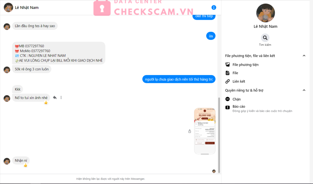 Alerte d'arnaqueur: Lê Nhật Nam Signalé: November 16, 2024 Informations sur l'arnaqueur Nom complet: Lê Nhật Nam Passerelle de paiement: MB Compte de paiement: 0377297760 Catégorie: Arnaques de marketplace Source: Checkscam Fichiers de preuves Description du rapport Lửa đảo mua bán tài khoản game mail ảo Commentaires Votre commentaire Ajouter un commentaire Pas encore de commentaires. Soyez le premier à partager votre expérience avec cet arnaqueur.