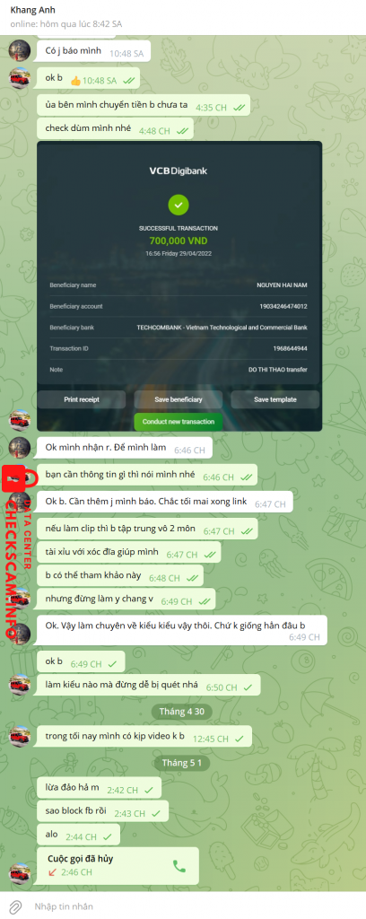 Chuyển tiền xong hết rồi im luôn. Facebook cũng block luôn. Facebook nó là Đức Mạnh nhưng mình không kịp chụp lại. Ae cẩn thận nhé.