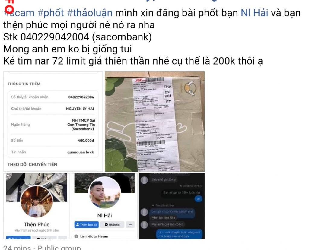 Hình đính kèm là bill ck của mình và hình thứ 2 là thông tin một bạn khác trên group đã tố cáo bạn Thện Phúc và bạn Hải này là scam