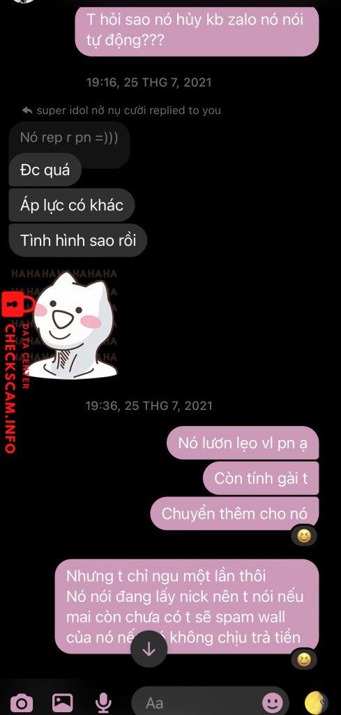 Mình nhờ nó lấy lại acc fb với giá 250k, sau khi chuyển tiền cho nó thì nó bắt đầu nhây lấy acc (nhắn tin bên zalo) sau một khoản thời gian thì nó block acc của mình luôn. Thời gian đó nó làm mình rất khủng hoảng vì mình mắc chứng rối loạn âu lo. Mình có thử dùng acc clone giả làm acc nó, kết bạn fb với bạn bè nó và đăng bài phốt, nhưng khi chưa kịp đăng nó đã phát hiện và hack cái acc clone đó. Một thời gian sau nó hack acc zalo của mình luôn nên mình đã bị mất bằng chứng, chỉ còn lại tin nhắn mình nhắn với bạn bè bảo rằng mình đã bị lừa. Thằng này 2k5, đã vậy nó còn đăng giao dịch của mình lên story của nó, mình cay lắm :)) hiện nay nó vẫn sống tốt và có vẻ chưa bị ai phốt nên mình đăng lên đây ạ, các hình ảnh đều là thật, mình nhắn tin trong khoảng tg tháng 7 năm ngoái nên không có chuyện bịa đặt đâu ạ. Fb nó tên Nguyễn Phú Khương với hơn 100k fl (hack fl) nhìn uy tín chứ thật ra là lừa. Khi mình vào spam tường của nó thì nó khoá cmt.