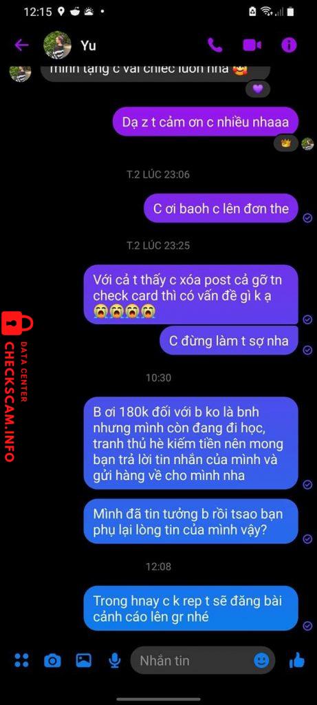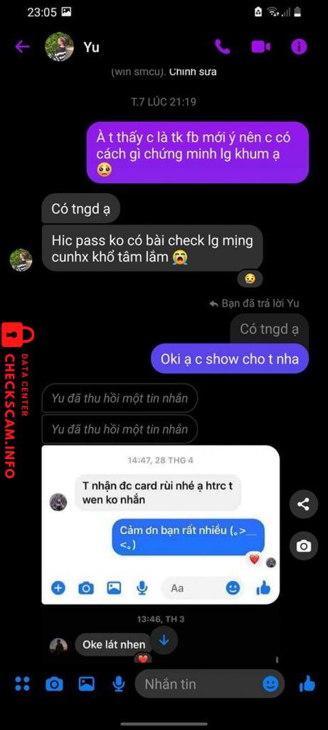 Ngày 6/6, mình không còn thấy bài đăng bán card của bạn đâu, vào xem tin nhắn thì thấy bạn gỡ hết video và ảnh check card, cùng với 2 ảnh tngdtc. Lúc này mình cũng xác định là mất tiền rồi, mình đã thử ib bạn và nó chỉ hiện đã gửi (có thể do bạn bỏ qua tin nhắn của mình?)