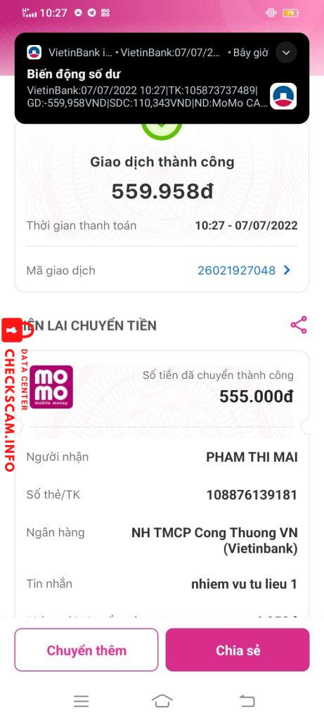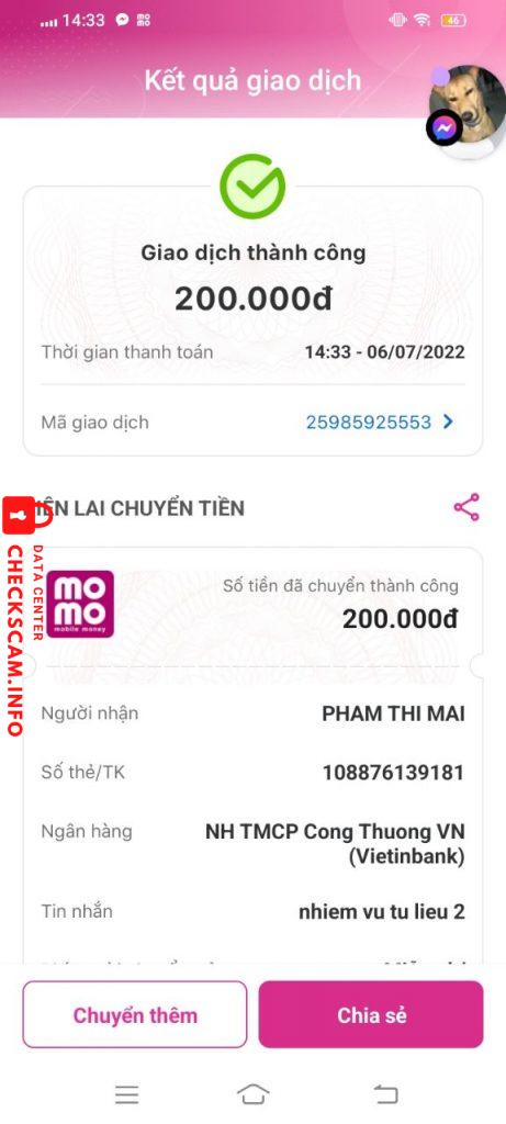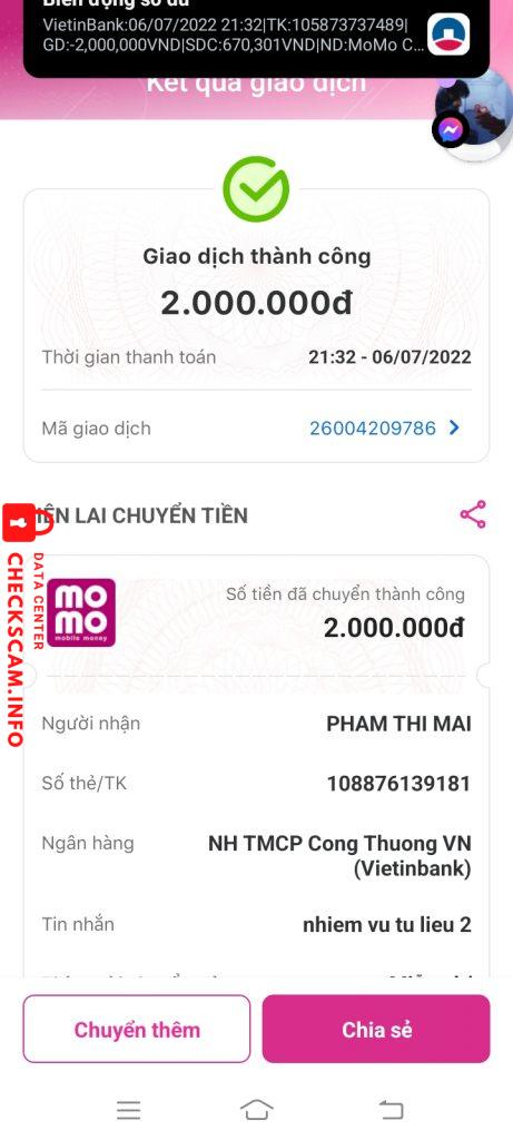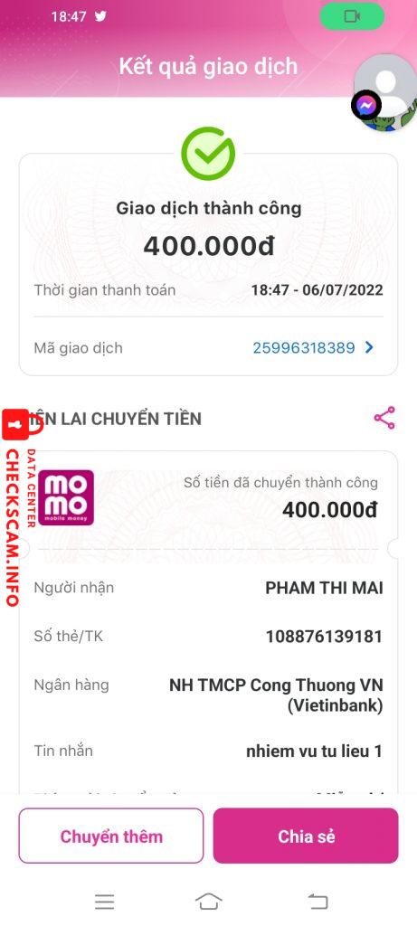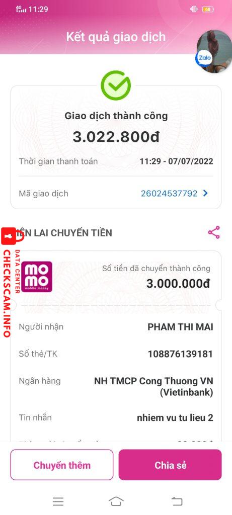 Alerte d'arnaqueur: Phạm Thị Mai