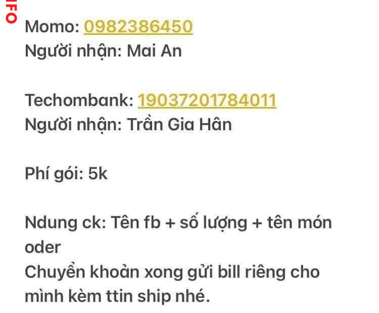 Trần Gia Hân (tk ngân hàng) + Mai An (sđt momo)