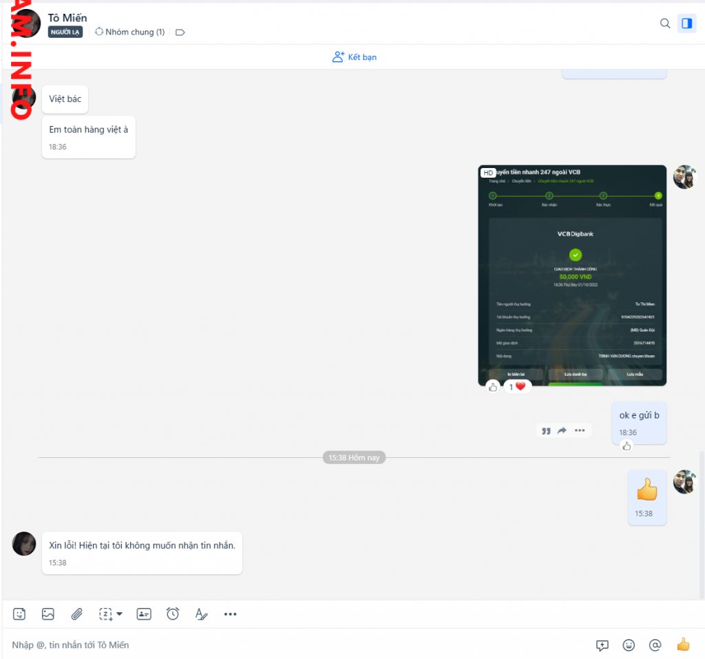 Peringatan Penipu: To Thi Mien Dilaporkan: November 16, 2024 Informasi Penipu Nama Lengkap: To Thi Mien Gerbang Pembayaran: Mb Bank Akun Pembayaran: 9704229202547431 Kategori: Penipuan marketplace Sumber: Checkscam Berkas Bukti Deskripsi Laporan E mua acc die 282. có 50k mà nó cũng scam. đúng thằng trẻ trâu Komentar Komentar Anda Tambahkan Komentar Belum ada komentar. Jadilah yang pertama berbagi pengalaman Anda dengan penipu ini.