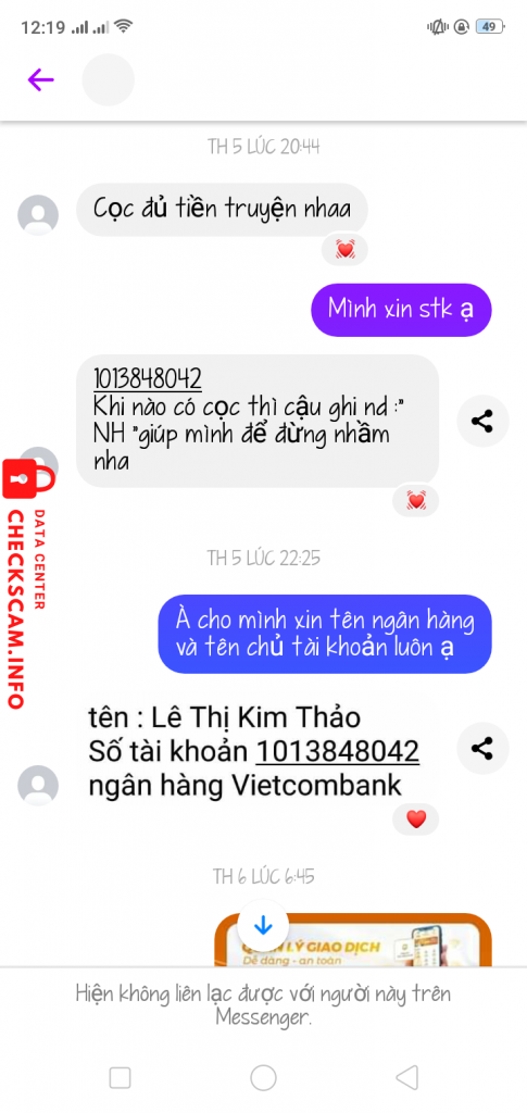 Peringatan Penipu: Lê Thị Kim Thảo Dilaporkan: November 16, 2024 Informasi Penipu Nama Lengkap: Lê Thị Kim Thảo Gerbang Pembayaran: Vietcombank Akun Pembayaran: 1676603747469 Kategori: Penipuan marketplace Sumber: Checkscam Berkas Bukti Deskripsi Laporan Nhân camp jjk vol 3 limited, người mua đã chuyển khoảng tiền truyện nhưng không giao và block. Komentar Komentar Anda Tambahkan Komentar Belum ada komentar. Jadilah yang pertama berbagi pengalaman Anda dengan penipu ini.