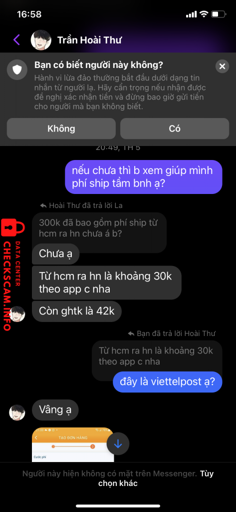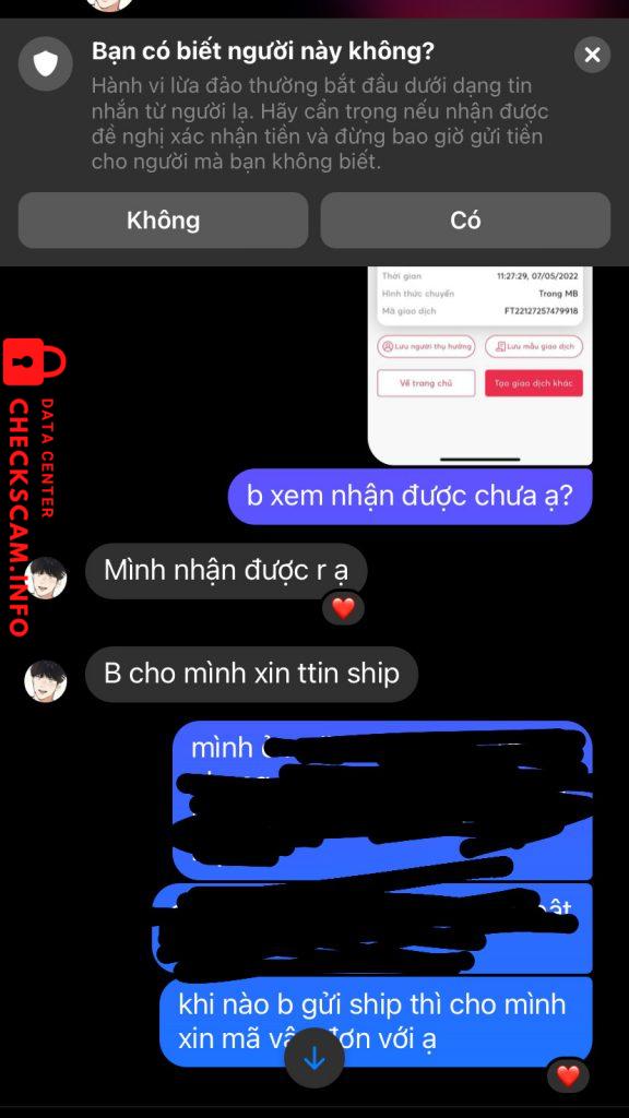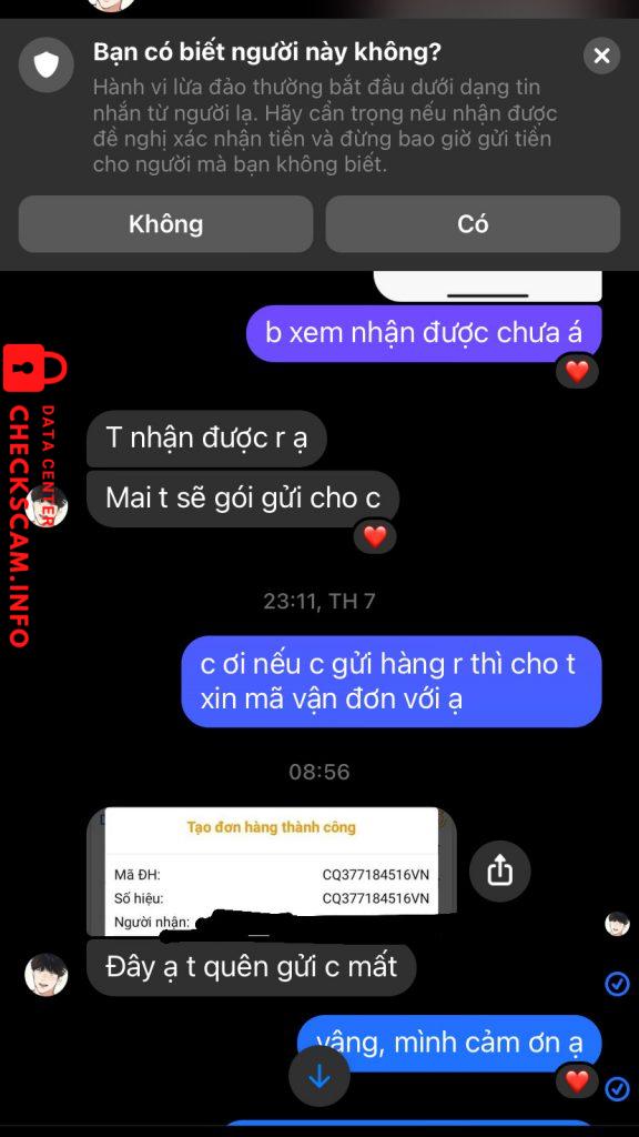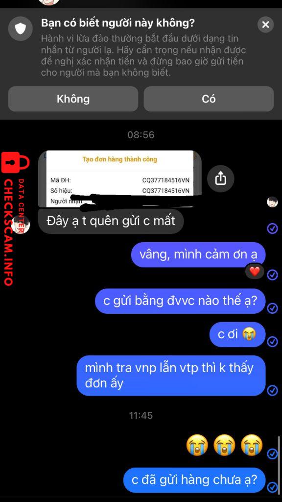 Hôm sau mình hỏi lại thì gửi cho mình mã vận đơn vnpost fake, mình hỏi lại do không tìm thấy đơn trên hệ thống thì ko rep và block luôn cả fb lẫn messenger.