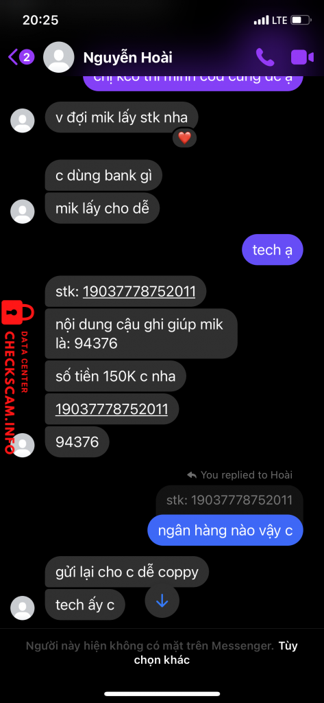 Peringatan Penipu: Phan Quoc Hung Dilaporkan: November 16, 2024 Informasi Penipu Nama Lengkap: Phan Quoc Hung Gerbang Pembayaran: techcombank Akun Pembayaran: 19037778752011 Kategori: Penipuan marketplace Sumber: Checkscam Berkas Bukti Deskripsi Laporan Lừa tiền để mua chơi lô đề Komentar Komentar Anda Tambahkan Komentar Belum ada komentar. Jadilah yang pertama berbagi pengalaman Anda dengan penipu ini.