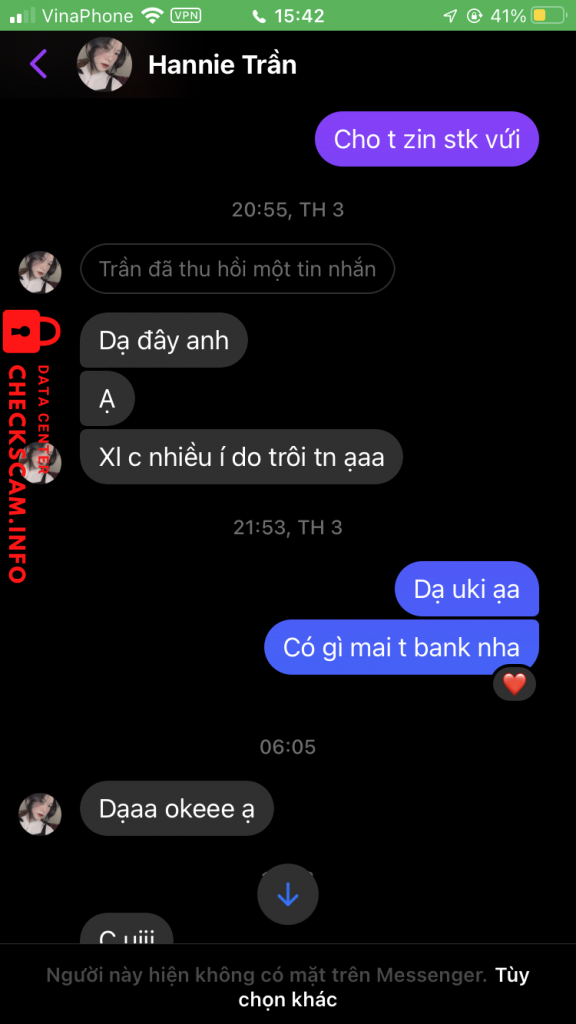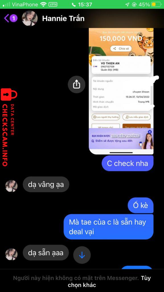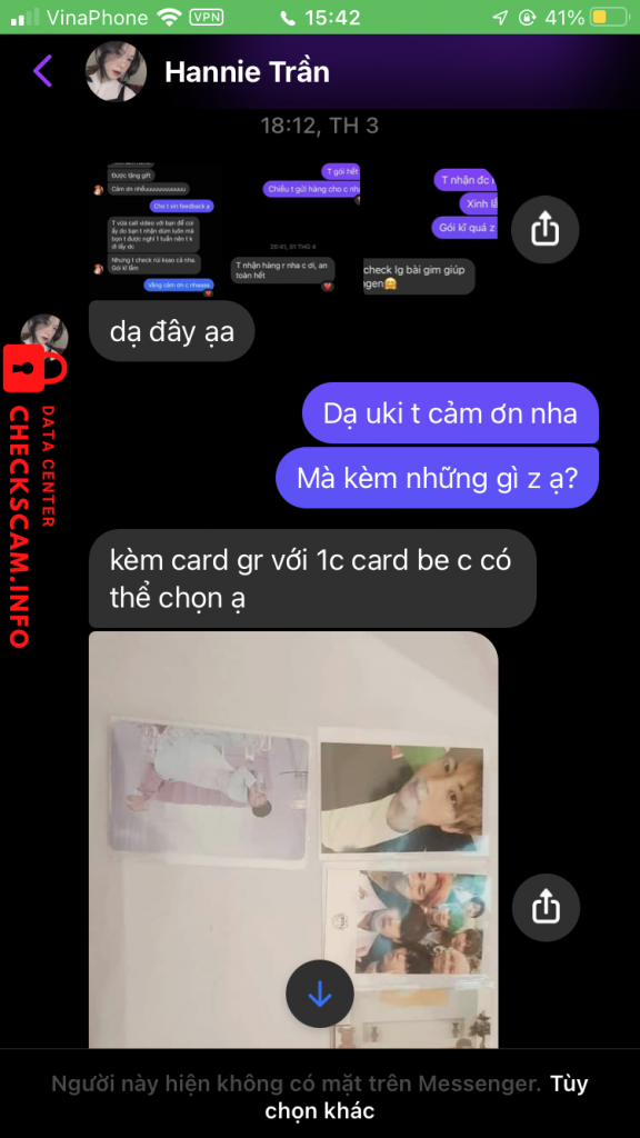 Tôi mua của bạn ý 1 tấm card BTS. Lúc đầu với giá là 250 và lúc đó tôi đang bảo là tôi không còn tiền nên bạn ý đã sale xuống còn 150k và tôi đồng ý mua, lúc tôi bảo bạn ý cho tôi check legit thì bạn ý kêu là cho tôi xem bạn ý giao dịch với người khác xong tôi đồng ý thì bạn ý đang học onl và ko cho tôi xem ngay dc và tôi đồng ý đợi bạn ý xong khi check xong thì tôi chuyển tiền cho bạn và tôi bị scam 🙂