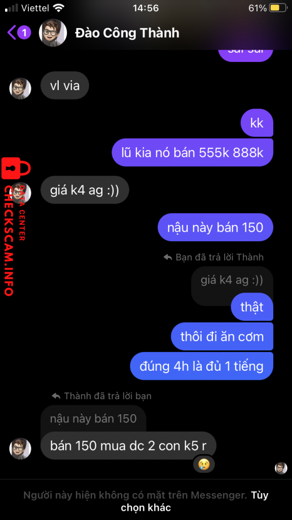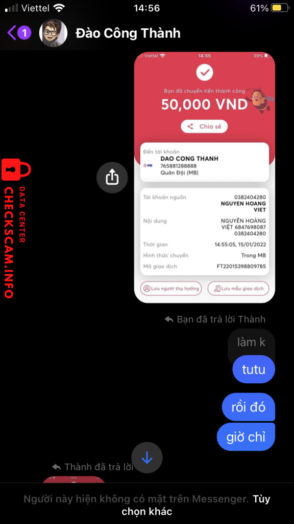 詐欺師警告: Đào Công Thành 報告済み: November 16, 2024 詐欺師情報 氏名: Đào Công Thành 決済ゲート: MB Bank 決済アカウント: 765881288888 カテゴリー: マーケットプレイス詐欺 ソース: Checkscam 証拠ファイル 報告の説明 nó hướng dẫn tôi nhận tiền từ app ONUS rồi nó bảo không đủ usd để rút, xong nó bảo là chuyển nó 50k để nó chuyển usd cho đủ rồi rút, xong nó vẫn kêu chưa đủ nên chuyển tiếp 50k thế là 100k, chuyển xong nó kêu 1h nữa nhận tiền, 1h sau block コメント あなたのコメント コメントを追加 まだコメントはありません。この詐欺師についての経験を最初に共有しましょう。