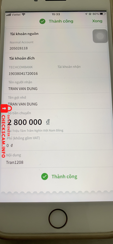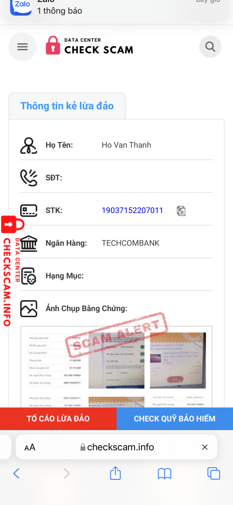 詐欺師警告: HO VAN THANH 報告済み: November 16, 2024 詐欺師情報 氏名: HO VAN THANH 決済ゲート: TECHCOMBAMK 決済アカウント: 19037152207011 カテゴリー: マーケットプレイス詐欺 ソース: Checkscam 証拠ファイル 報告の説明 Lừa gạt qua trang kiếm hoa hồng コメント あなたのコメント コメントを追加 まだコメントはありません。この詐欺師についての経験を最初に共有しましょう。