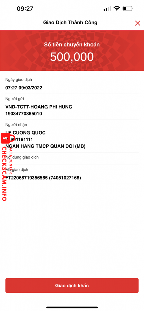 詐欺師警告: LE CUONG QUOC 報告済み: November 16, 2024 詐欺師情報 氏名: LE CUONG QUOC 電話番号: 03601191111 決済ゲート: Mb bank 決済アカウント: 03601191111 カテゴリー: マーケットプレイス詐欺 ソース: Checkscam 証拠ファイル 報告の説明 Lừa đào trên fb. Mn cẩn thận コメント あなたのコメント コメントを追加 まだコメントはありません。この詐欺師についての経験を最初に共有しましょう。