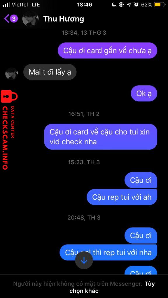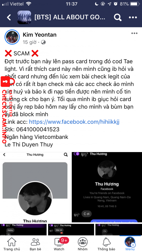 Đợt trước bạn này lên pass card trong đó cod Tae light. Vì rất thích card này nên mình cũng ib hỏi và chốt card nhưng đến lúc xem bài check legit của bạn có rất ít bạn check mà các acc check ảo mình xin huỷ và bảo k đi nạp tiền được nên mình cố tin tưởng ck cho bạn ý. Tối qua mình ib giục hỏi card bsnj ấy rep bảo hôm nay lấy cho mình và bùm bạn ấy đã block mình