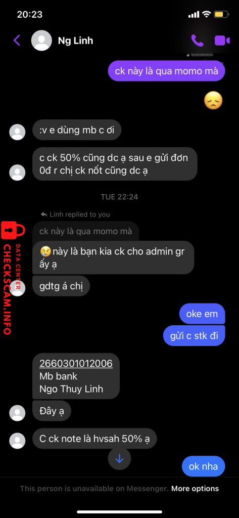 詐欺師警告: Ngo Thuy Linh 報告済み: November 16, 2024 詐欺師情報 氏名: Ngo Thuy Linh 決済ゲート: MB Bank 決済アカウント: 2660301012006 カテゴリー: マーケットプレイス詐欺 ソース: Checkscam 証拠ファイル 報告の説明 đã nghi ngờ từ trước nhưng thấy thân thiện quá nên vẫn ck 🙁 cái ngu này xin không lặp lại lần 2 コメント あなたのコメント コメントを追加 まだコメントはありません。この詐欺師についての経験を最初に共有しましょう。