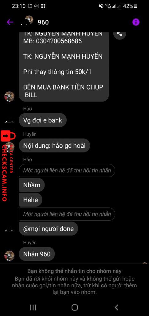 詐欺師警告: NGUYỄN MẠNH HUYẾN 報告済み: November 16, 2024 詐欺師情報 氏名: NGUYỄN MẠNH HUYẾN 電話番号: 0932267136 決済ゲート: MB 決済アカウント: 0304200568686 カテゴリー: マーケットプレイス詐欺 ソース: Checkscam 証拠ファイル 報告の説明 2 thằng hợp tác lừa đảo tôi 960 コメント あなたのコメント コメントを追加 まだコメントはありません。この詐欺師についての経験を最初に共有しましょう。