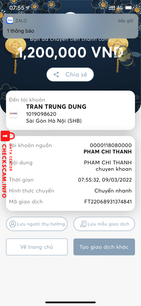 詐欺師警告: Tran Trung Dung 報告済み: November 16, 2024 詐欺師情報 氏名: Tran Trung Dung 決済ゲート: SHB 決済アカウント: 1019098620 カテゴリー: マーケットプレイス詐欺 ソース: Checkscam 証拠ファイル 報告の説明 Bán hàng qua sử dụng giá rẻ chuyển khoản trước rồi ship Thấy tồn tại trong group Uy tín nên tin tưởng chuyển tiền xong block コメント あなたのコメント コメントを追加 まだコメントはありません。この詐欺師についての経験を最初に共有しましょう。