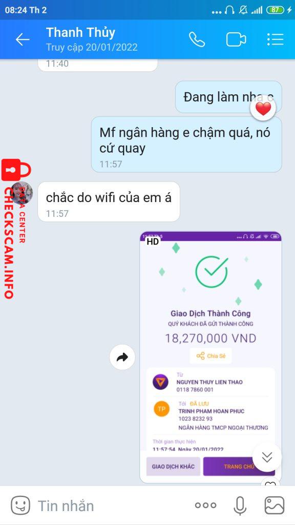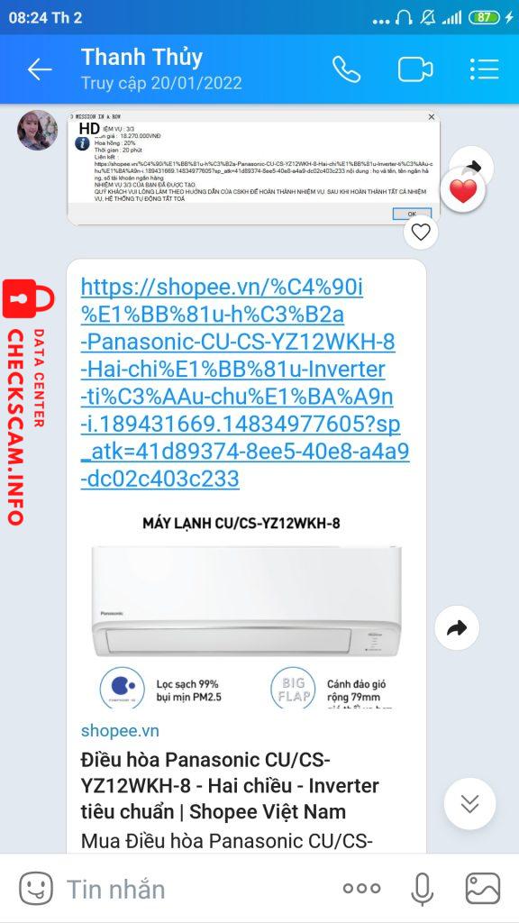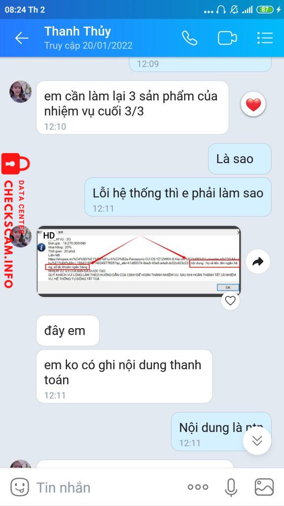Sau khi ad Zalo và trao đổi công việc thì tôi được biết công việc lên Shopee mua đơn hàng, sau khi chuyển khoản tiền thì tôi được hưởng 10% hoa hồng của sản phẩm mà tôi mua. Có nghĩa là tôi sẽ được nhận lại là tiền sảm phẩm mà tôi đã chuyên khoản + 10% hoa hồng của sản phẩm đó. Sau 4 giao dịch như vậy thì cô ta bắt đầu dụ tôi vào cái bẫy hoa hồng 20% bằng cách ép tôi mua 9 sản phẩm lien tiếp có tổng giá trị lên đến 94 triệu đồng