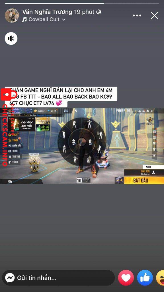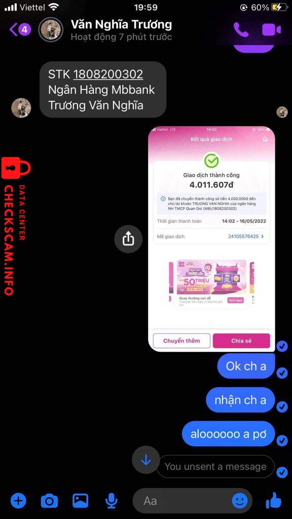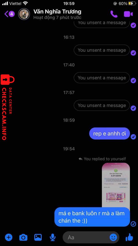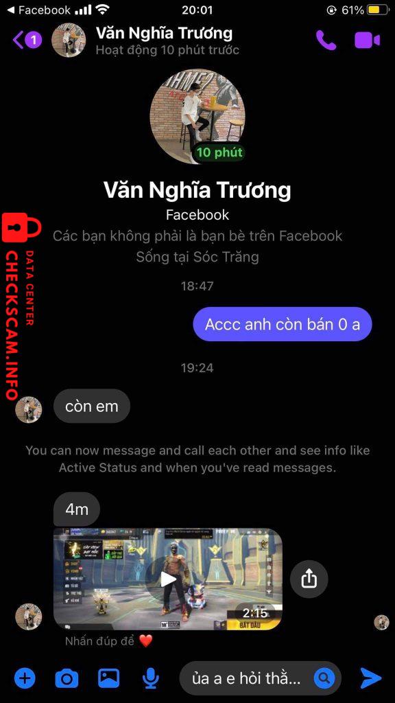 thì chuyện là như này vào lúc 16/05/2022 14h02 tôi có mua acc của Trương Văn Nghĩa biệt danh là Tropper cũng là 1 youtuber và cũng rất hot ở mxh hiện nay và sau đấy tui có ib hỏi là nhận chưa thì không rep và sau đấy tui cũng có đi inbox cho người yêu của Trương Văn Nghĩa thì nói là ông ấy chưa rep và cô ấy bảo ông ấy đã đi dâu rồi và lúc sau tui cũng có inbox rất là nhiều về vấn đề số tiền tui đã bank và người yêu ông ấy bảo là acc bị cái gì rồi xong tui mới ib ông ấy bảo là nếu acc bị gì thì anh hoàn giùm em với ?? và cũng có inbox ni ông ấy kêu hoàn nhưng mà vẫn cứ bơ bơ không giải quyết chuyện này rõ ràng và lúc 18/05/2022 2h02 sáng Trương Văn Nghĩa up 1 bài tus bán acc tâm huyết của anh ấy 1 lần nữa và story thế là 4tr của tôi vẫn chưa giải quyết , và sau dấy tôi có lập thử 1 acc fb clone inbox cho anh ấy thì hỏi là acc của anh còn không thì anh ấy bảo còn và tôi khẳng định là anh ta đã lừa đảo rất nhiều người !