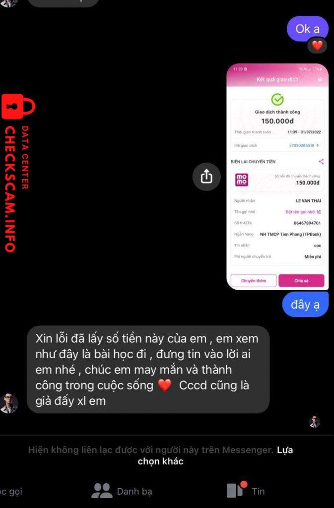 Oplichter Waarschuwing: Le Thai Gerapporteerd: November 16, 2024 Informatie over oplichter Volledige naam: Le Thai Betalingsgateway: TP Bank Betalingsaccount: 06467894701 Categorie: Marktplaatsfraudes Bron: Checkscam Bewijsbestanden Rapportbeschrijving lừa đảo lấy tiền xong chặn Reacties Uw reactie Reactie toevoegen Nog geen reacties. Wees de eerste die een ervaring deelt met deze oplichter.