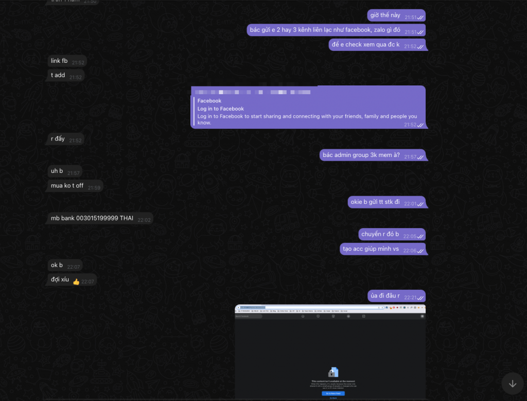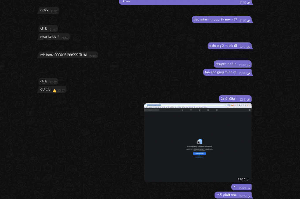 Scammer Alert: Truong Nguyen Quang Thai Reported: November 16, 2024 Scammer Information Full Name: Truong Nguyen Quang Thai Payment Gate: MB Bank Payment Account: 003015199999 Category: Marketplace scams Source: Checkscam Evidence Files Report Description Mình có đăng tin nhắn mua acc aws trên nhóm telegram. Bạn này bắt chuyện với mình. Comments Your comment Add Comment No comments yet. Be the first to share your experience with this scammer.