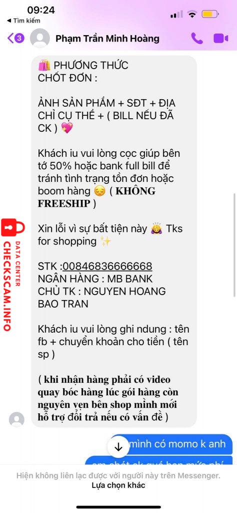 Scammer Alert: NGUYEN HOANG BAO TRAN Reported: November 16, 2024 Scammer Information Full Name: NGUYEN HOANG BAO TRAN Payment Gate: MB BANK Payment Account: 00846836666668 Category: Marketplace scams Source: Checkscam Evidence Files Report Description Comments Your comment Add Comment No comments yet. Be the first to share your experience with this scammer.
