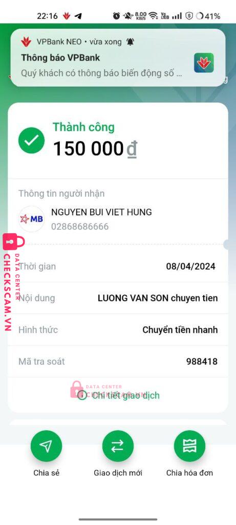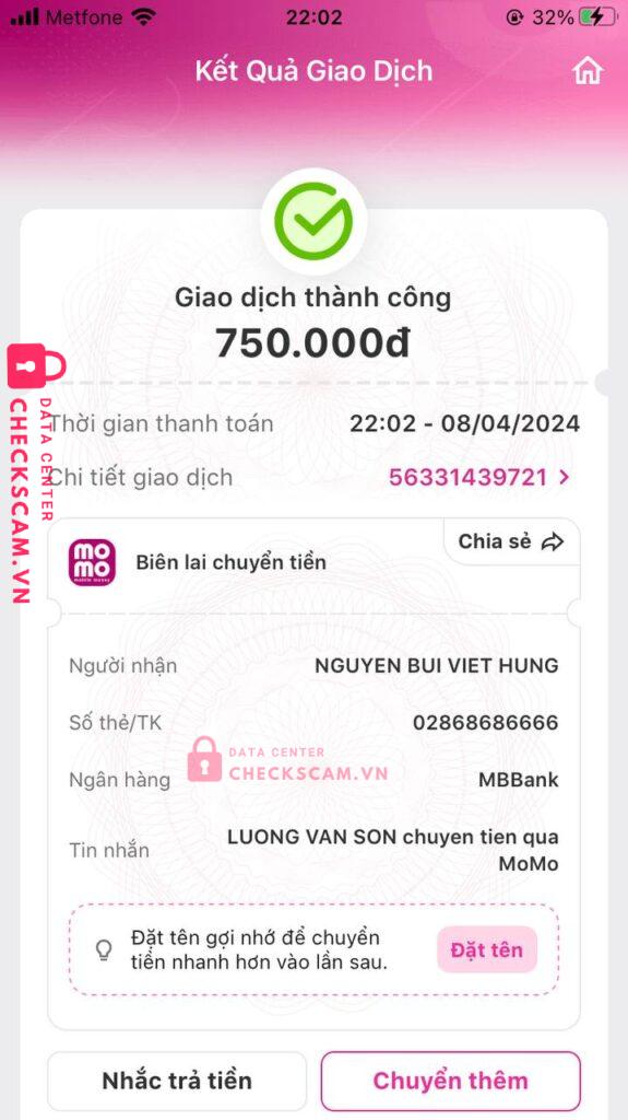 Scammer Alert: 02868686666 Reported: November 16, 2024 Scammer Information Full Name: 02868686666 Payment Gate: NGUYEN BUI VIET HUNG Payment Account: 02868686666 Category: Marketplace scams Source: Checkscam Evidence Files Report Description Bán nick fb nhưng không chịu đưa nick lươn lẹo là mua của người này người kia giờ bị người ta lừa Comments Your comment Add Comment No comments yet. Be the first to share your experience with this scammer.