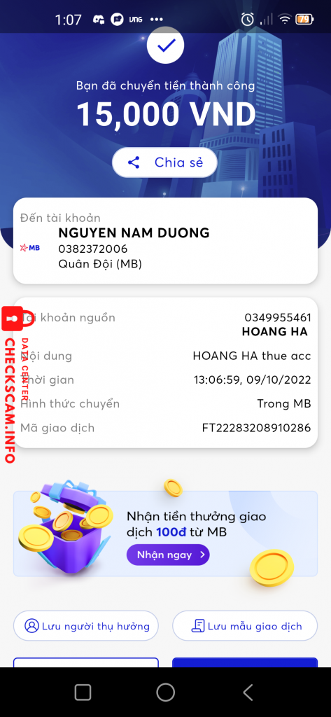 Scammer Alert: Nguyễn Nam Dương Reported: November 16, 2024 Scammer Information Full Name: Nguyễn Nam Dương Payment Gate: mb Payment Account: 0382372006 Category: Marketplace scams Source: Checkscam Evidence Files Report Description có 15k cũng đớp được, scammer đ gì giẻ rách vậy? Comments Your comment Add Comment No comments yet. Be the first to share your experience with this scammer.