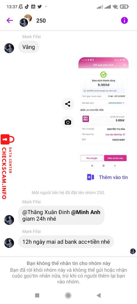 Scammer Alert: Thái Nhật Minh Reported: November 16, 2024 Scammer Information Full Name: Thái Nhật Minh Phone Number: 0382548387 Payment Gate: Momo Payment Account: 0382548387 Category: Marketplace scams Source: Checkscam Evidence Files Report Description Lừa đảo Comments Your comment Add Comment No comments yet. Be the first to share your experience with this scammer.