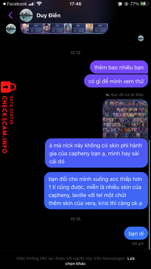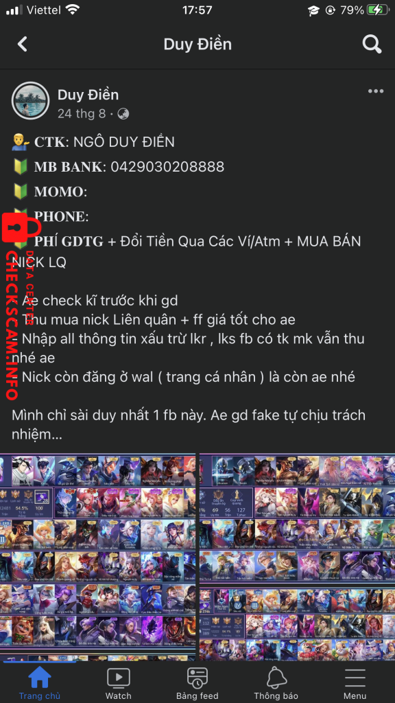 FB Duy Dien tiến hành lừa đảo thông qua việc buôn bán nick, sau khi nhận tiền thì tiến đến việc block người mua và gỡ tin nhắn số tài khoản đã gửi. Số tài khoản yêu cầu người mua gửi tiền vào và số tài khoản trên trang cá nhân FB là hai số tài khoản khác nhau. Vì chưa kịp chụp lại đoạn chat gửi thông tin chuyển khoản mà scammer đã nhắn nên em chỉ có bill chuyển khoản và ảnh cap số tài khoản được đăng trên FB cá nhân của nó. Bằng chứng rất cụ thể rõ ràng là scammer kia đã ăn tiền rồi chuồn.