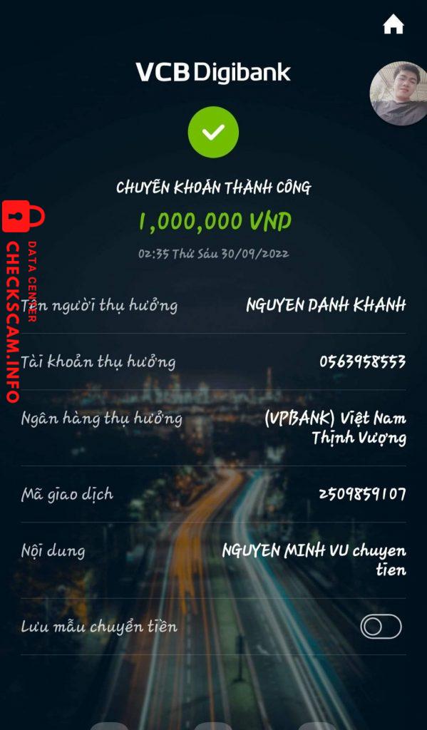 Scammer Alert: NGUYEN DANH KHANH Reported: November 16, 2024 Scammer Information Full Name: NGUYEN DANH KHANH Payment Gate: Vpbank Payment Account: 0563958553 Category: Marketplace scams Source: Checkscam Evidence Files Report Description Lừa đảo Comments Your comment Add Comment No comments yet. Be the first to share your experience with this scammer.