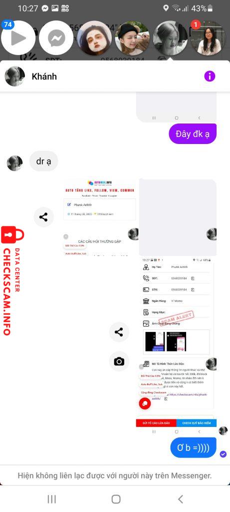 Scammer Alert: Phưnk Anhhh Reported: November 16, 2024 Scammer Information Full Name: Phưnk Anhhh Phone Number: 0568039184 Payment Gate: Ví Momo Payment Account: 0568039184 Category: Marketplace scams Source: Checkscam Evidence Files Report Description Comments Your comment Add Comment No comments yet. Be the first to share your experience with this scammer.