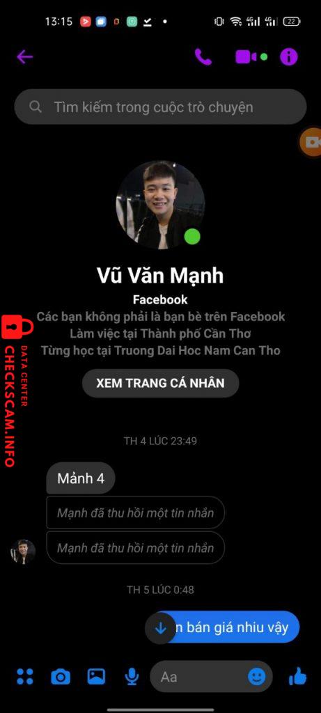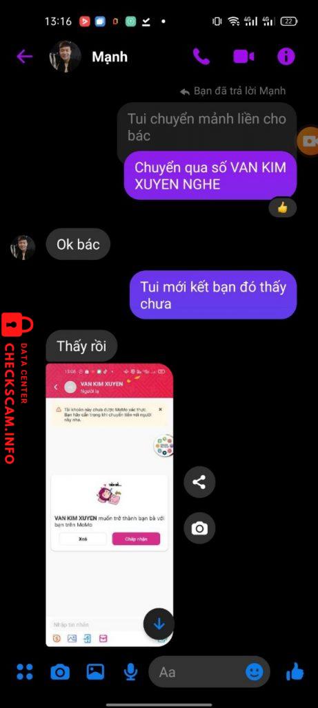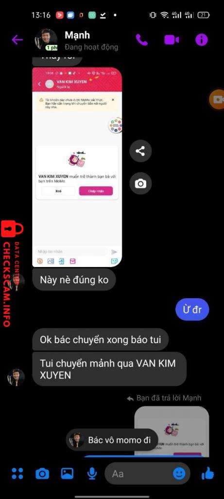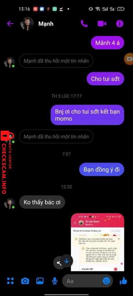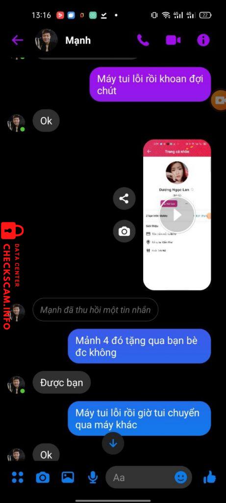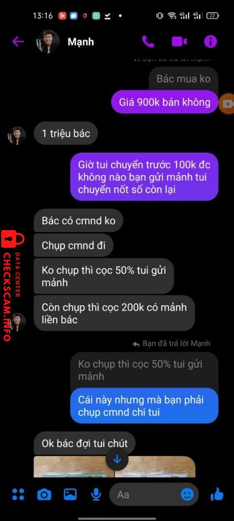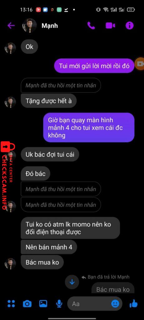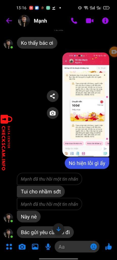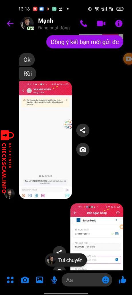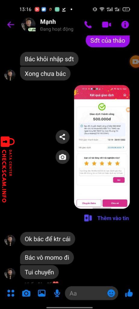 đối tượng đã sử dụng cớ là không có tài khoản liên kết ngân hàng để lừa chuyển tiền cho bạn của hắn là Nguyễn Thu Thảo. Trong quá trình nhắn tin hắn đã cung cấp chứng minh nhân dân để làm tin, sau đó lừa đảo bán mảnh ghép điện thoại iphone 13 với giá là 500k. Tuy nhiên sau khi mình chuyển tiền xong thì hắn đã chặn tin nhắn và xóa tài khoản facebook của hắn.