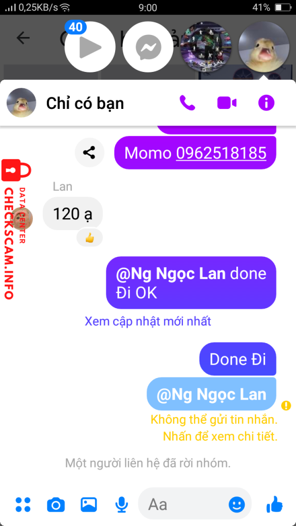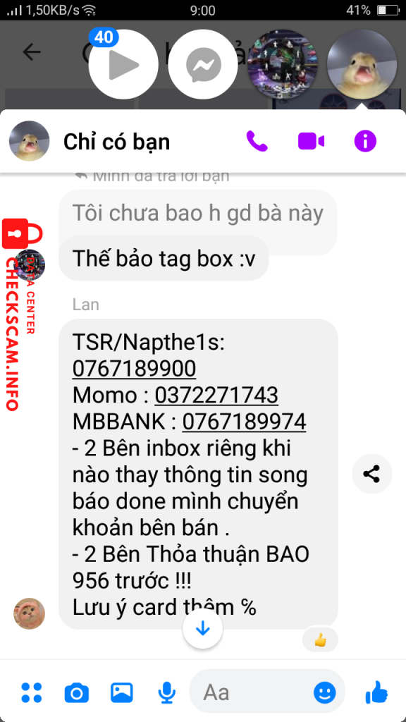 Scammer Alert: 0767189974 Reported: November 16, 2024 Scammer Information Full Name: 0767189974 Phone Number: 0372271743 Payment Gate: MB BANK Payment Account: 0767189974 Category: Marketplace scams Source: Checkscam Evidence Files Report Description Làm giao dịch trung gian đưa acc cho người mu xong chốn Comments Your comment Add Comment No comments yet. Be the first to share your experience with this scammer.