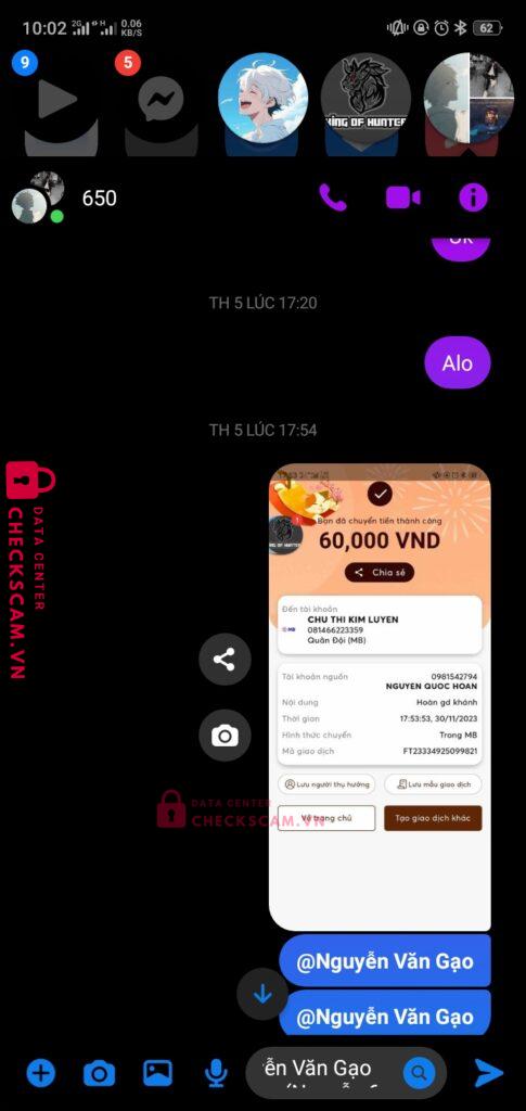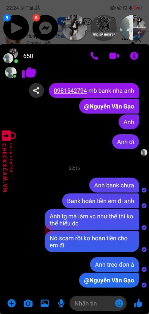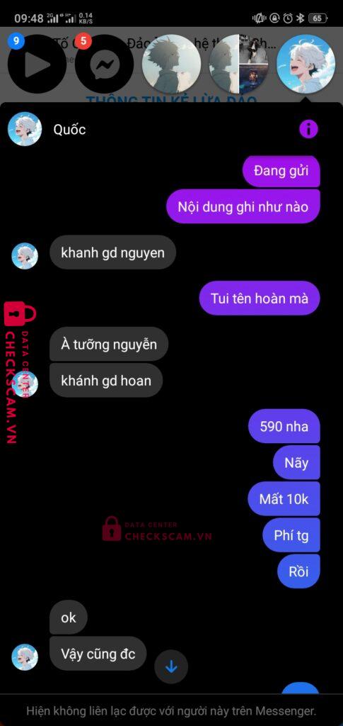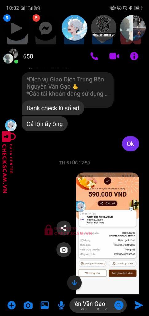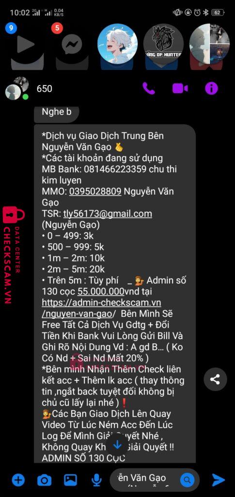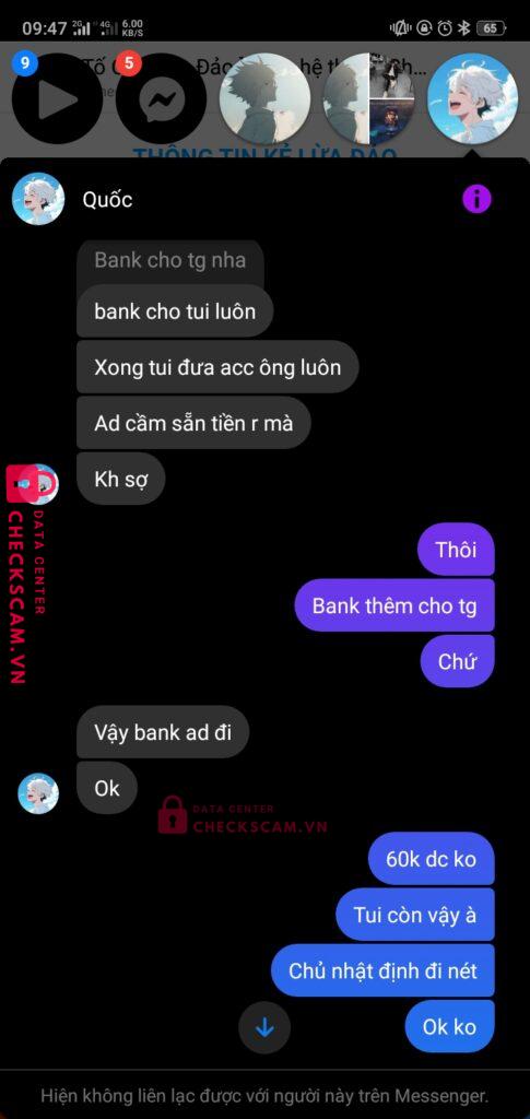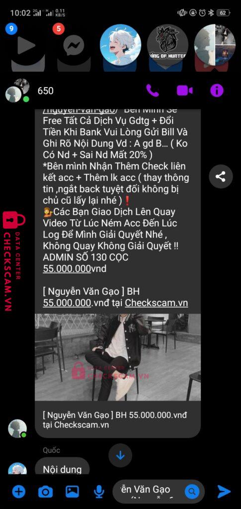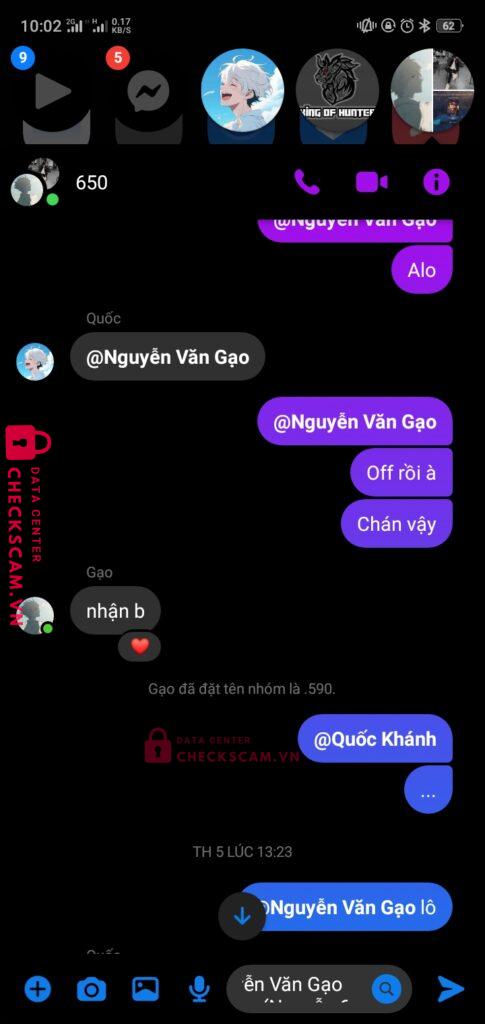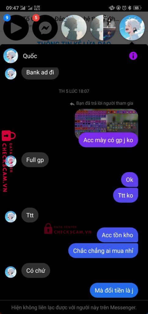 Nguyễn văn gạo làm tg cho gd mua acc của hoan nguyễn và quốc khánh . nhưng quốc khánh đã chặn và xóa tg ra khỏi nhóm nhưng tôi đã liên hệ dc gạo và xin lại tiền nhưng gạo ko trả mà còn ko rep trong 2 ngày rồi . ko bt tg kiểu này thì ai giám gd