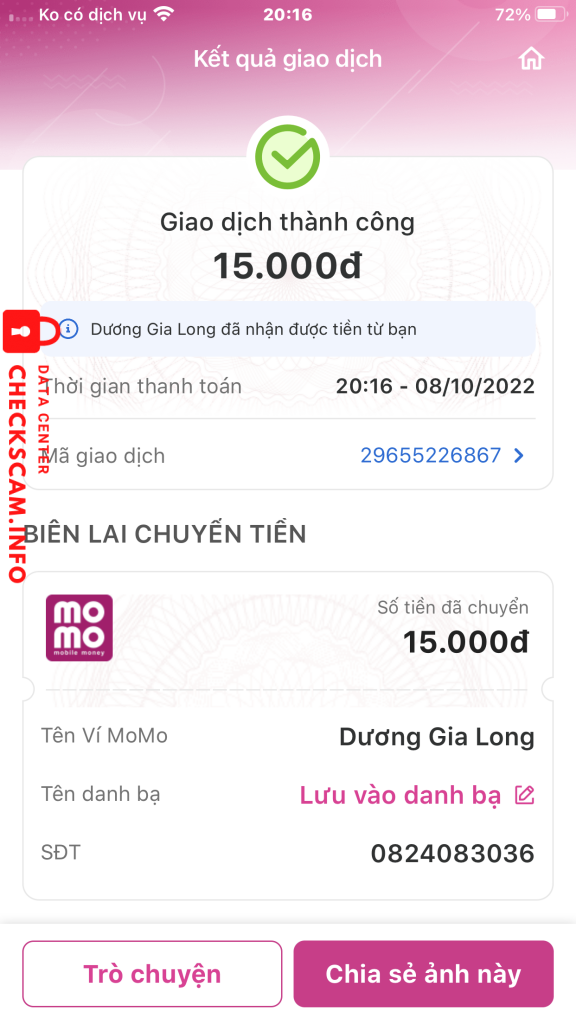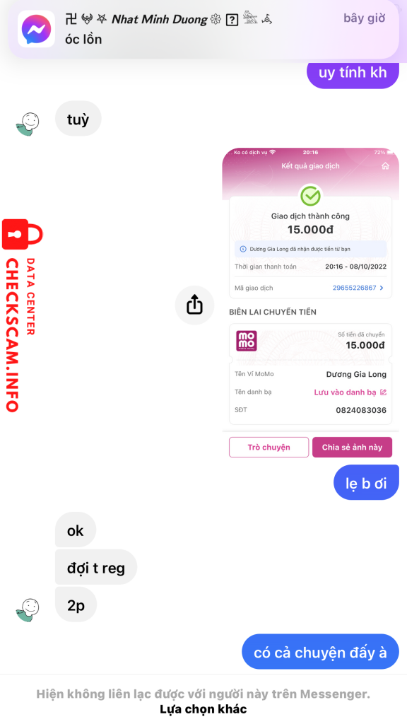 Scammer Alert: Dương Gia Long Reported: November 16, 2024 Scammer Information Full Name: Dương Gia Long Phone Number: 0824083036 Payment Gate: Momo Payment Account: 0824083036 Category: Marketplace scams Source: Checkscam Evidence Files Report Description S*c V*t Scam 15k Rách Mn Né Ạ Comments Your comment Add Comment No comments yet. Be the first to share your experience with this scammer.