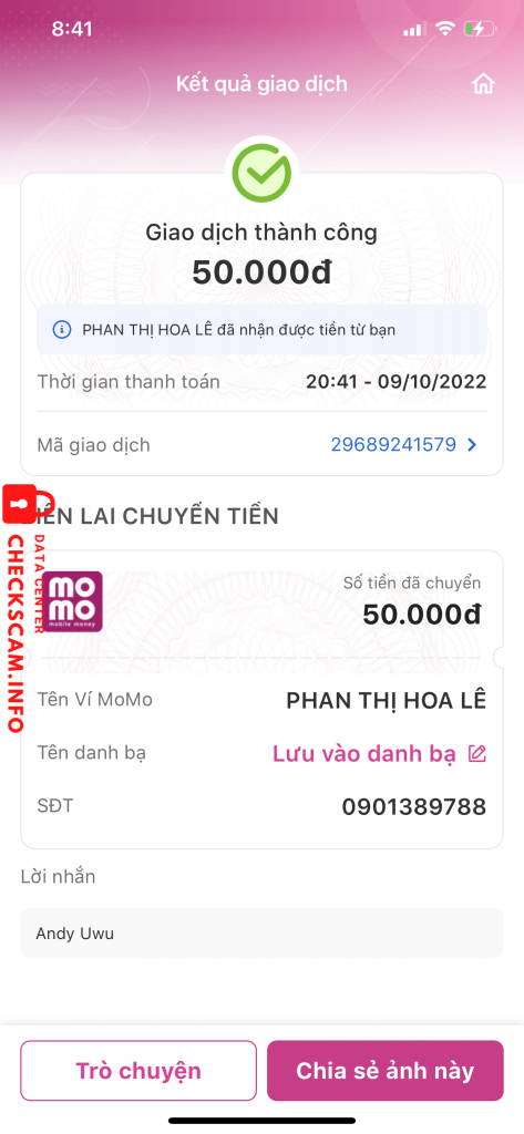 Scammer Alert: PHÂN THỊ HOA LÊ Reported: November 16, 2024 Scammer Information Full Name: PHÂN THỊ HOA LÊ Phone Number: 0901389788 Payment Gate: Momo Payment Account: 0901389788 Category: Marketplace scams Source: Checkscam Evidence Files Report Description Scam Comments Your comment Add Comment No comments yet. Be the first to share your experience with this scammer.