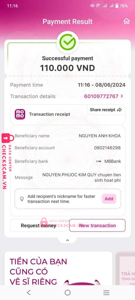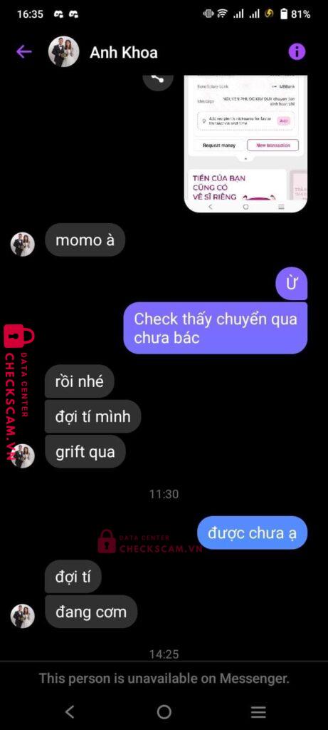 Scammer Alert: 0902146298 Reported: November 16, 2024 Scammer Information Full Name: 0902146298 Payment Gate: MB Payment Account: NGUYENANHKHOA Category: Marketplace scams Source: Checkscam Evidence Files Report Description Mua game 110k nhưng do nghĩ uy tín nên không đợi trung gian và lãnh hậu quả Comments Your comment Add Comment No comments yet. Be the first to share your experience with this scammer.