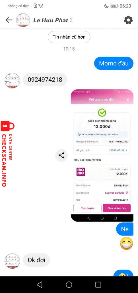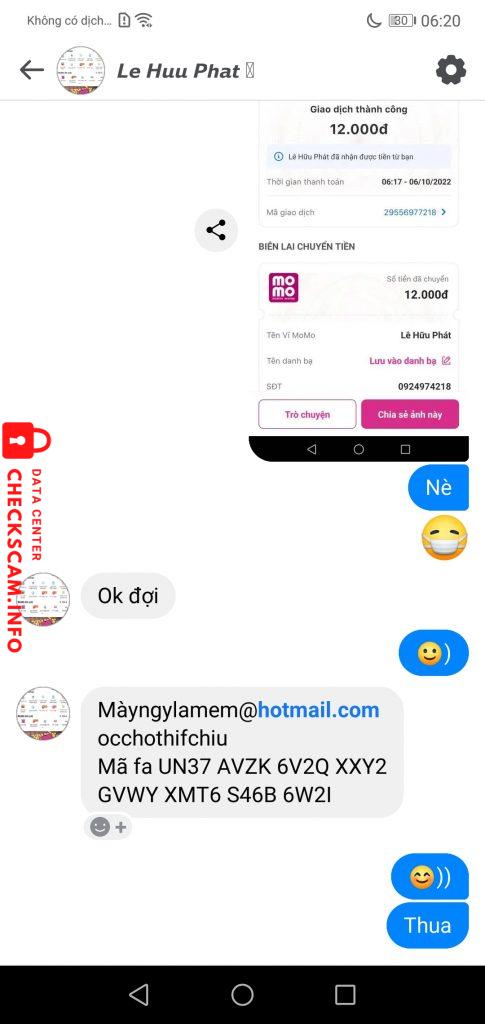 Scammer Alert: Lê Hữu Phát Reported: November 16, 2024 Scammer Information Full Name: Lê Hữu Phát Phone Number: 0924974218 Payment Gate: Momo Payment Account: 0924974218 Category: Marketplace scams Source: Checkscam Evidence Files Report Description Mua acc và scam xong block Comments Your comment Add Comment No comments yet. Be the first to share your experience with this scammer.